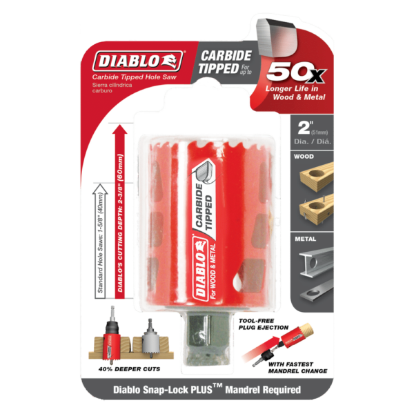 Diablo introduces the first carbide-tipped hole saws on the market to cut both wood and metal (wood, nail-embedded wood, plastic, aluminum, metal, cast iron, stainless steel and metal). Delivering 50 times longer cutting life than bi-metal, these new carbide-tipped hole saws offer faster cutting performance and increased productivity.
